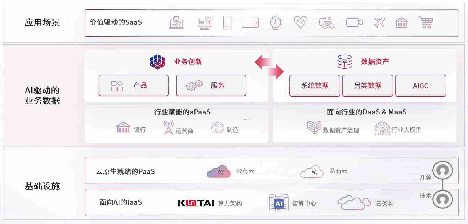 数字时代,,,围绕企业数字化转型的关键要素,,z6尊龙数码开创性的提出数云融合战略和技术体系框架,,,着力在云原生、、、数字原生、、、、AI原生和信创产业上架构产品和服务能力,,,为处在不同数字化转型阶段的快消零售、、、、汽车、、、、金融、、、医疗、、、政企、、教育、、运营商等行业客户提供泛在的敏捷IT能力和融合的数据驱动能力,,构建跨界融合创新的数字业务场景和新业务模式,,助力企业级客户建立面向未来的核心能力和竞争优势,,,全面推动社会的数字化、、、、智能化转型升级。。。。