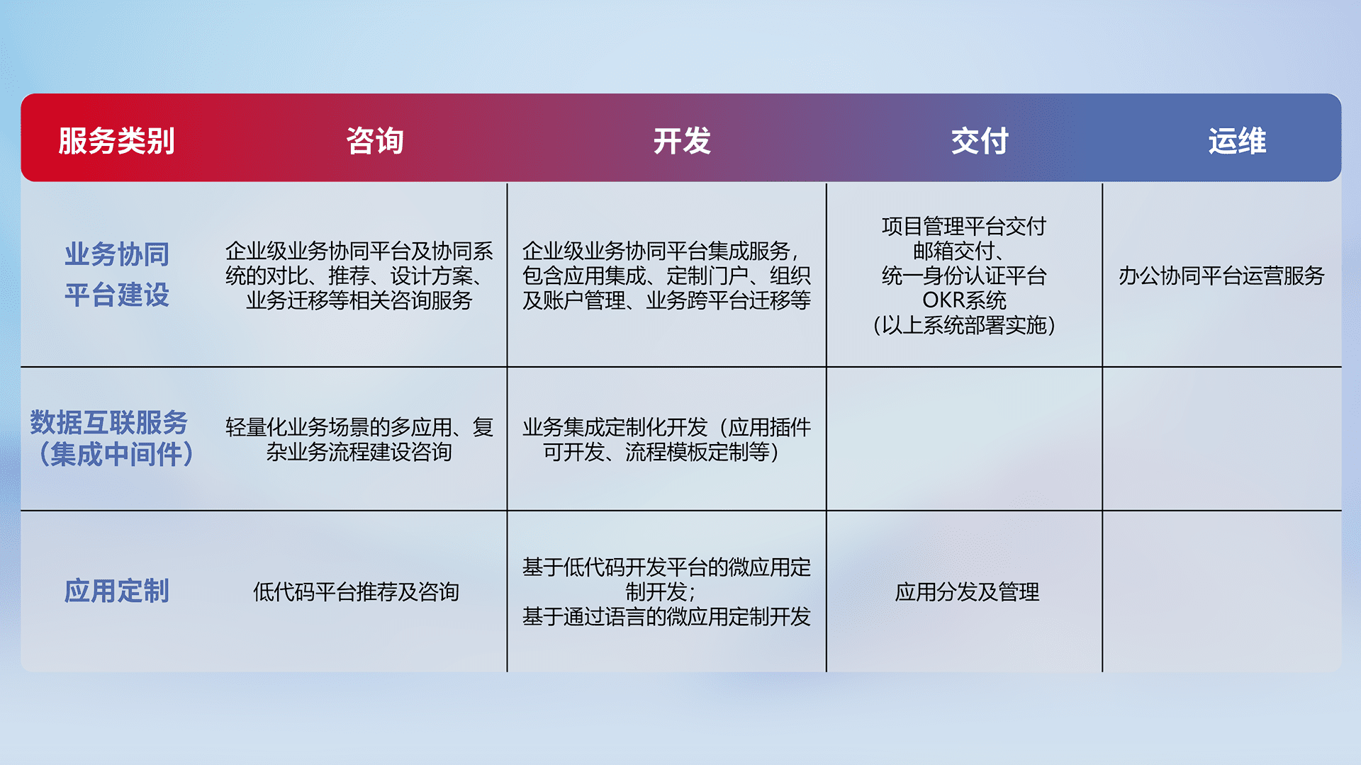 针对钉钉、、、、企微、、、、IDaas等平台级产品提供产品的规划、、、、方案、、、交付、、定制化开发等服务,,,,实现如统一协同办公、、智能客户服务、、混合会议管理、、智能数据查询、、等业务场景,,,实现数字化转型。。